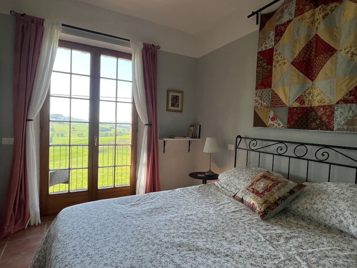 This double en-suite bedroom (“Trapunto”) with king-sized bed is on the ground floor (the guest apartment is on the ground floor, with stairs leading down to the studio) on the kitchen side of the apartment. It has a balcony, which looks out over the countryside of Umbria and Tuscany. The completely renovated en-suite shower room is an internal room, but is very light.
