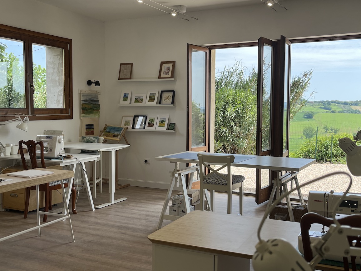 The purpose-built studio is accessed either from a staircase off the sitting room, or from the outside of the house – the house is built on a slope so the studio is on the ground floor at the back. It has wonderful views over the Umbrian and Tuscan countryside, including glimpses of Chiusi lake. It has individual workstations set up with sewing machines and lamps, two large cutting out tables, an overlocker station, ironing boards, bookcases etc. There’s a kitchenette for making drinks during the day, and a round table for tea breaks. It’s light and bright – a lovely space for working.